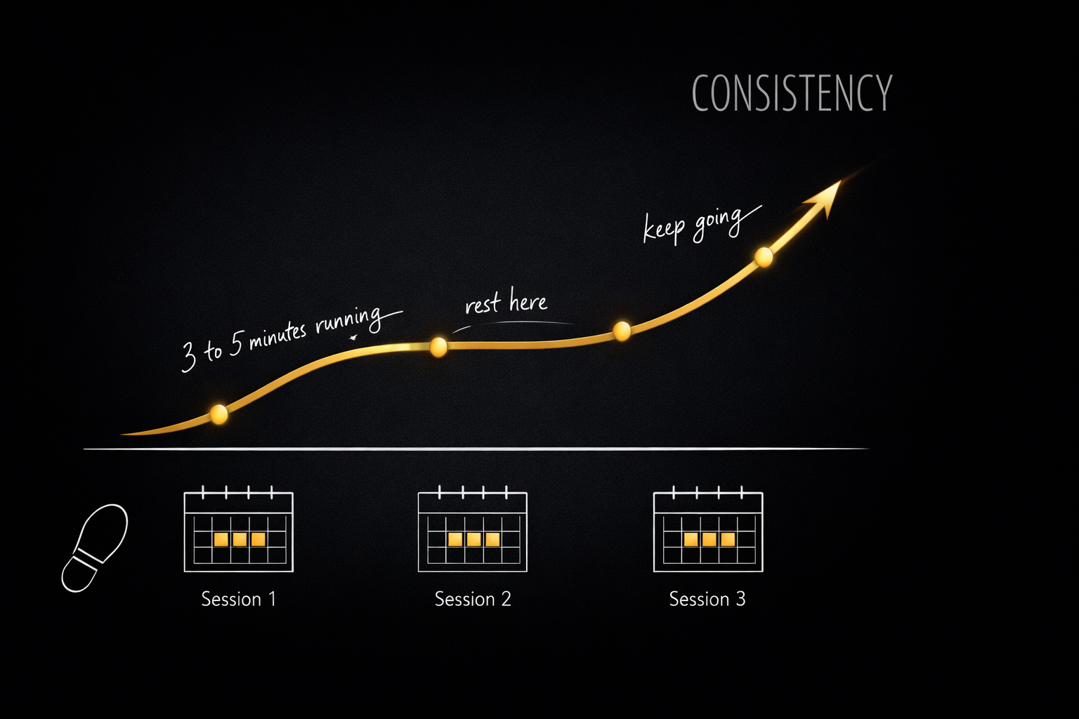 Extend your running intervals to 3-5 minutes with 1 minute walking. Aim for 3 sessions per week. Consistency matters more than distance at this stage.