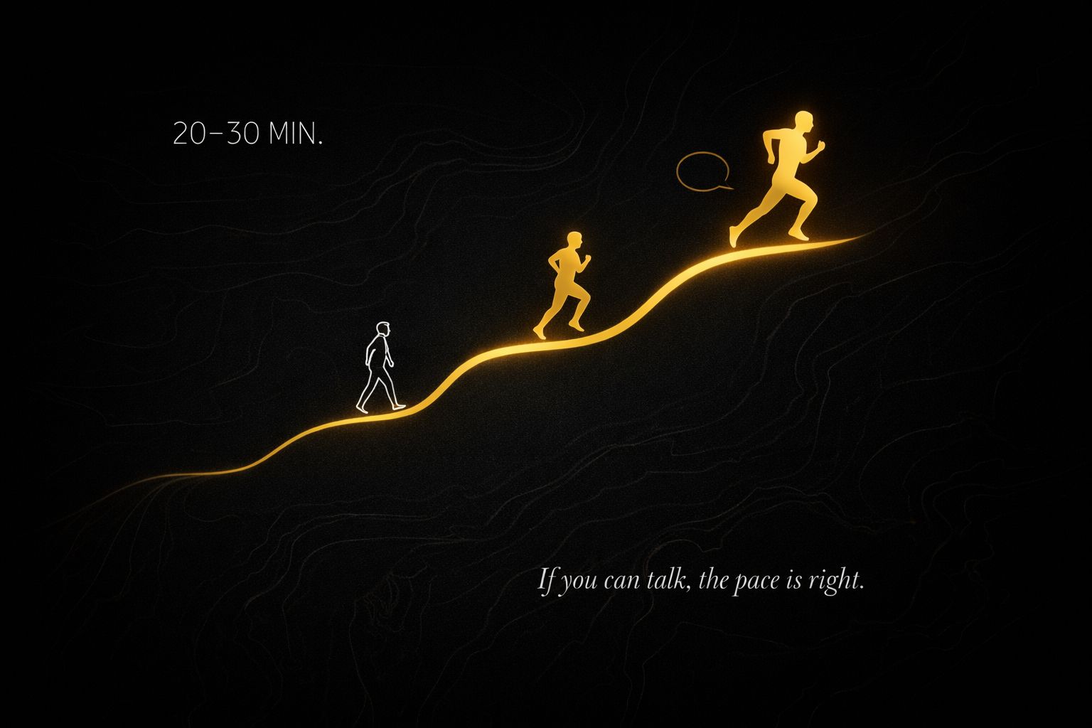 By week 5 most beginners can run 20-30 minutes without stopping. Don't worry about pace — if you can hold a conversation, you're running at the right speed.