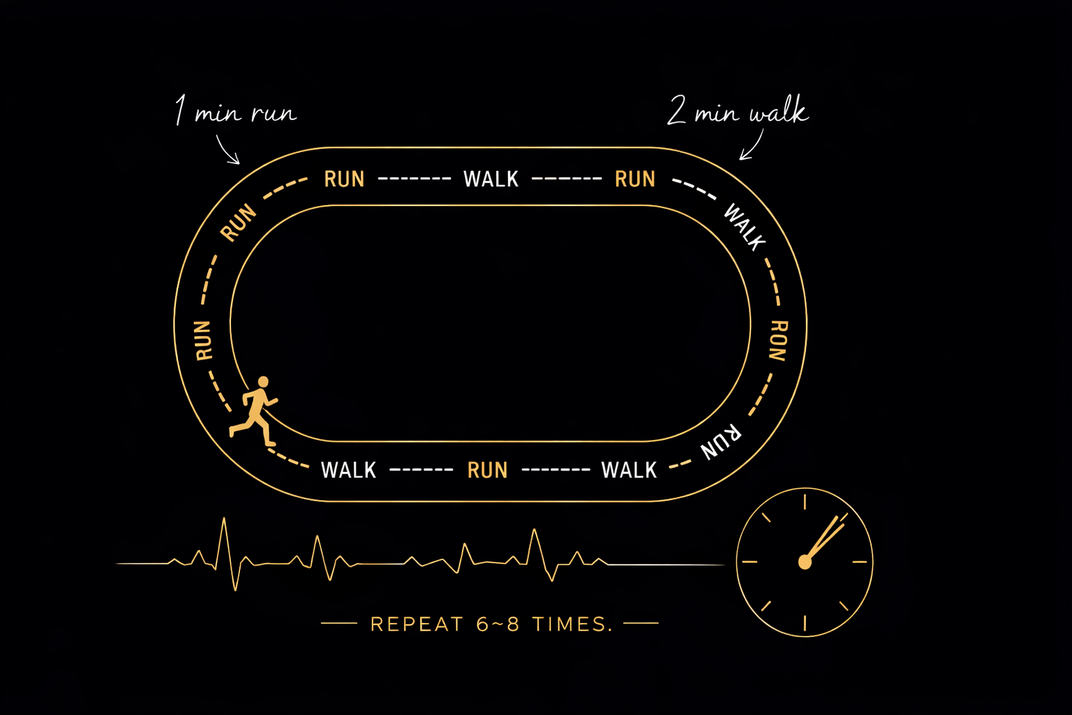 Start with 1 minute running, 2 minutes walking. Repeat 6-8 times. This builds your aerobic base without destroying your legs. No shame in walking — it's part of the process.