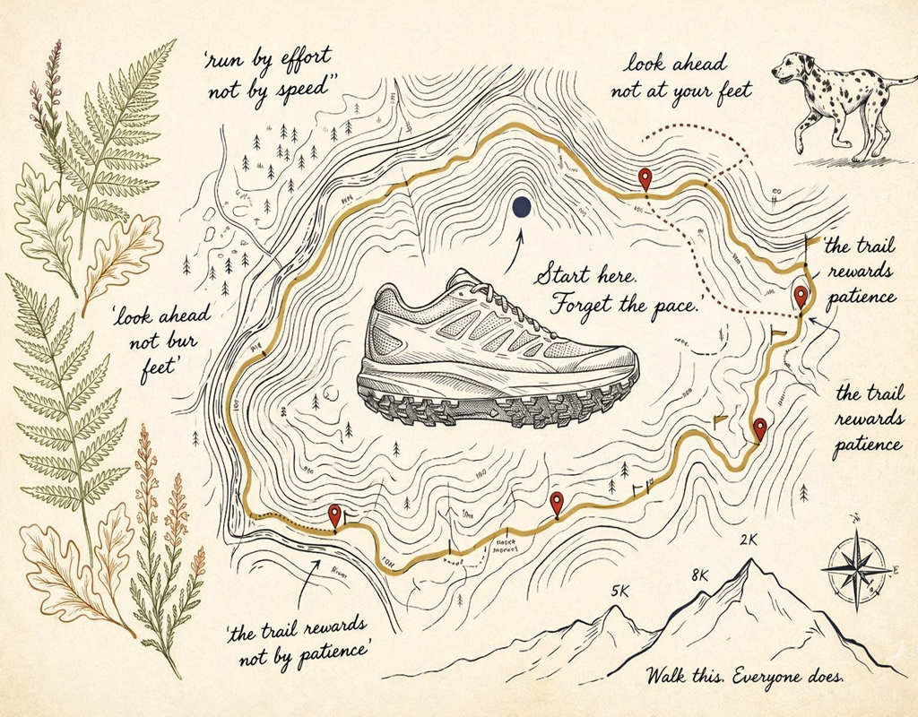 Your first trail run should be shorter than you think necessary. Half the distance of your typical road run. The terrain will work you harder than the numbers suggest.