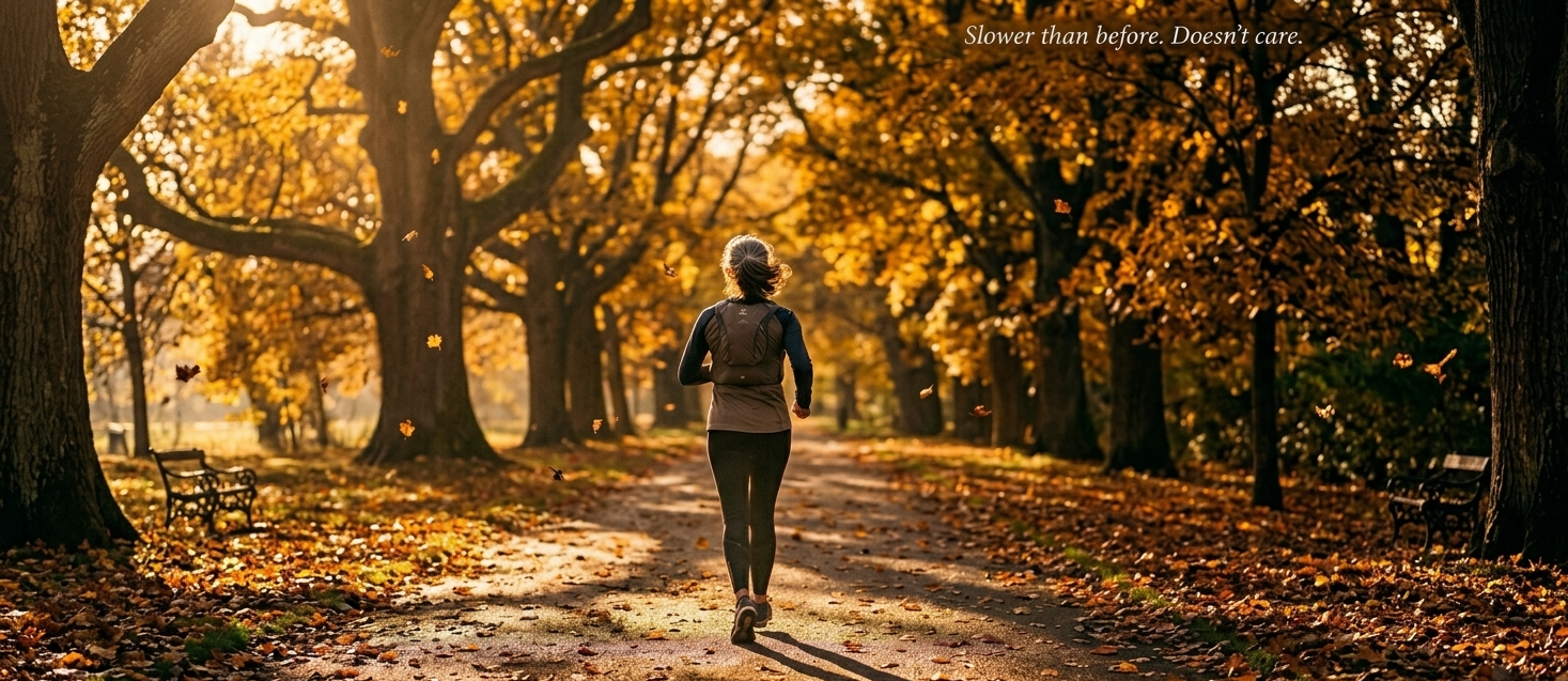 Hasn't run since school. Started again at 42. Slower than before. Doesn't care.